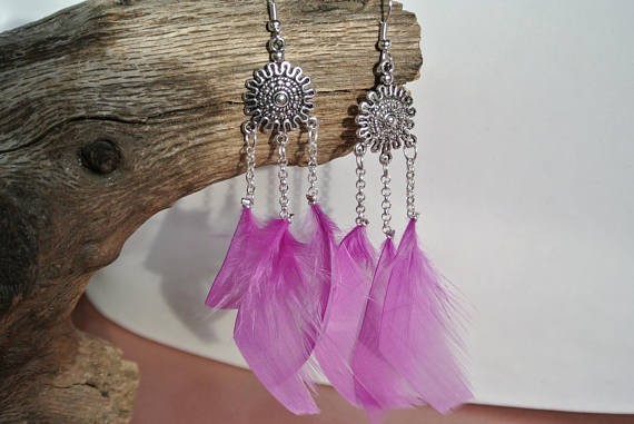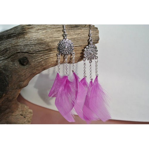 Boucles doreilles avec 3 plumes dun rose vif au bout de 3 chaînettes maille ronde sur petit connecteur soleil couleur argent vieilli, longueur : 8,5 cm et largeur : 1,8 cm Crochet argenté sans nickel