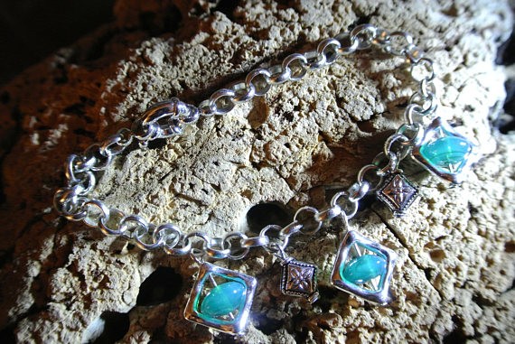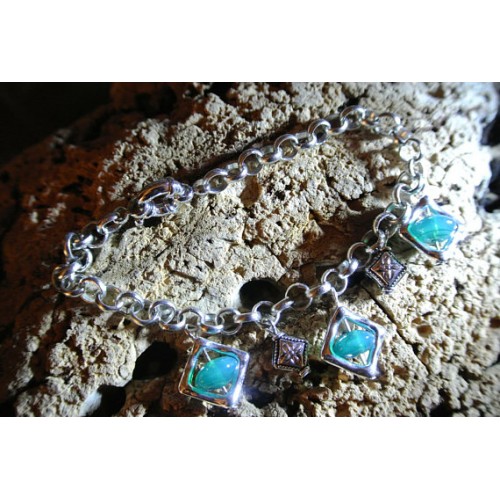 Bracelet maille ronde 6 mm argentée, perles de verre vert émeraude sur perles cadres losanges métal argenté