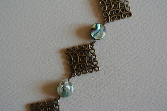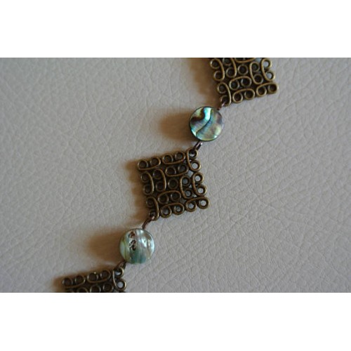 Bracelet constitué de connecteurs à l'effet fil enroulé en forme de losange couleur bronze, perles de nacre abalone, longueur : 20 cm, fermoir toggle