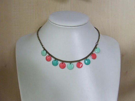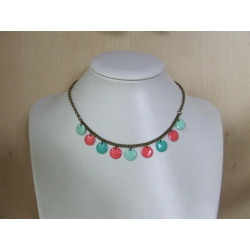 Parure composée dun collier ras du cou avec des sequins ronds émaillés déclinés en trois couleurs : rose corail, turquoise et vert deau sur jolie chaîne gourmette fine couleur bronze, longueur : 41 cm allongeable de 5 cm avec la chaînette dextension Les boucles doreilles tout à fait originales reprennent les couleurs des sequins ainsi que la chaîne gourmette, suspendues sur chaîne et tige torsadée couleur bronze Chaînes et mousqueton sans nickel et sans plomb Il est indispensable de bien positionner le collier avant de le mettre afin que les sequins se mettent en place régulièrement