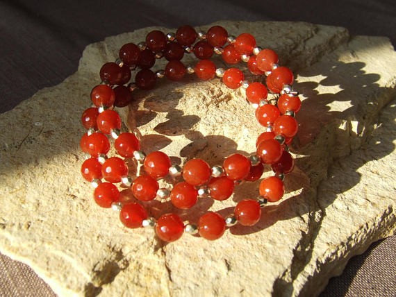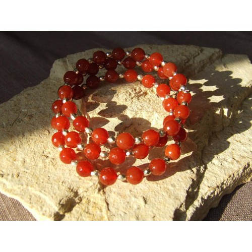 Bracelet manchette 3 rangs perles rondes à facettes en cornaline rouge-orangé et perles à facettes en métal argenté sur fil à mémoire de forme, diamètre 55-60 mm Le bracelet à mémoire de forme peut être déformé pour le mettre au poignet, il reprendra sa forme initiale, cependant si vous tirez très fortement sur ses extrémités, les rangs seront moins serrés et cela sera définitif. Vous recevrez le bracelet pris en photo