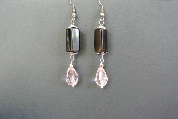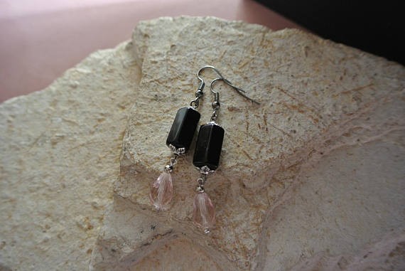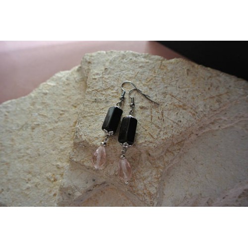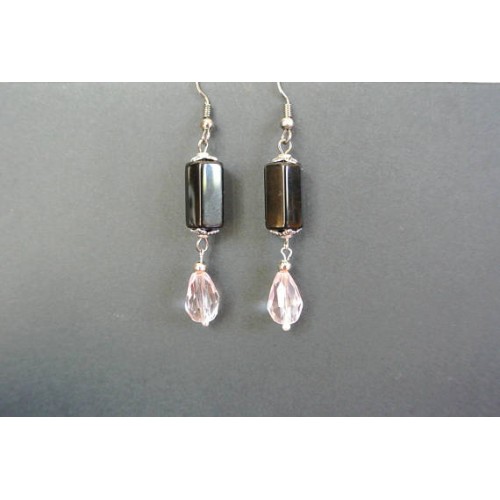 Boucles d'oreilles perle tube à 5 pans en verre noir sur perle forme goutte verre rose