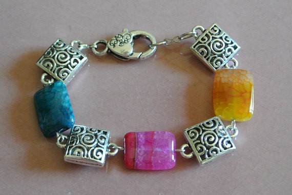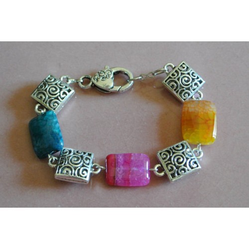 Bracelet femme composé dune alternance de trois jolies pierres en agate veines de dragon de forme rectangulaire 20 x 15 mm, épaisseur : 5-6 mm, de couleur bleu-vert sombre, rose-fuchsia et jaune-orangé et de jolis connecteurs argentés de forme carrée bombée, ajourés de motifs géométriques, gros fermoir en métal argenté, longueur : de 19 à 20 cm Vous recevrez le bracelet pris en photo