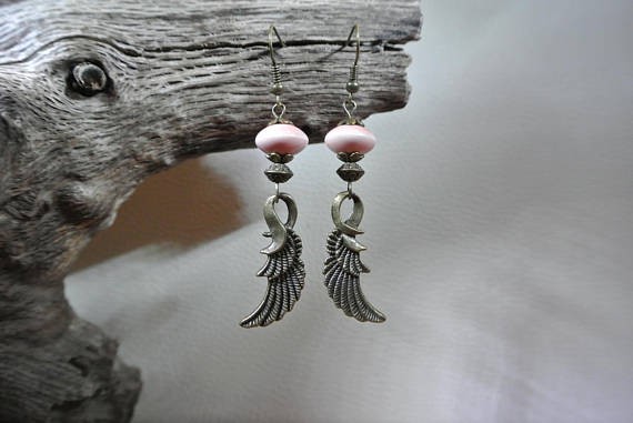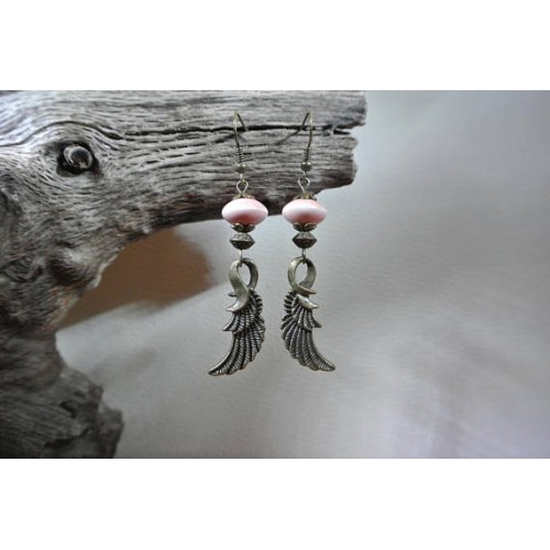 Boucles d'oreilles perle céramique rose et breloque aile bronze sur crochet, longueur : 5 cm