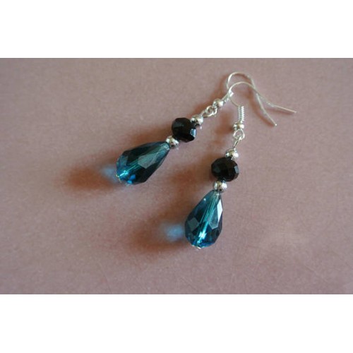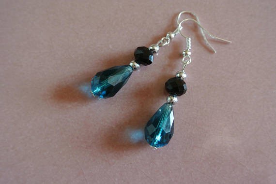 Boucles d'oreilles perle de verre à facettes goutte turquoise bleu canard et perle rondelle noire sur crochet argenté