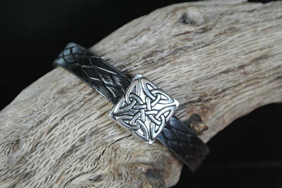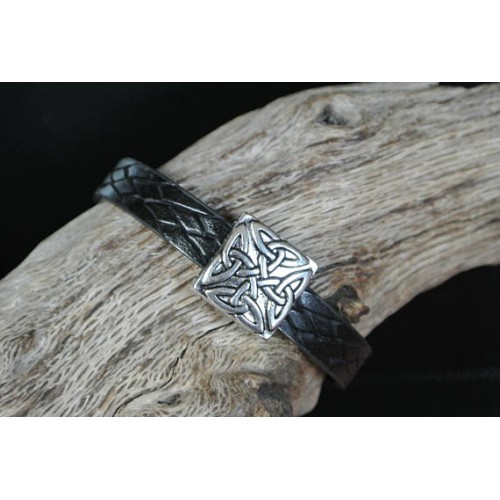 Bracelet homme 20,5 cm très jolie perle argentée, forme palet carré aux motifs celtiques, insérée sur un bracelet plat noir effet cuir tressé, très jolie imitation de cuir, dessous mousse, fermoir argenté à clipser Vous recevrez le bracelet pris en photo