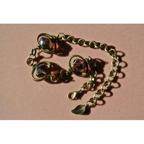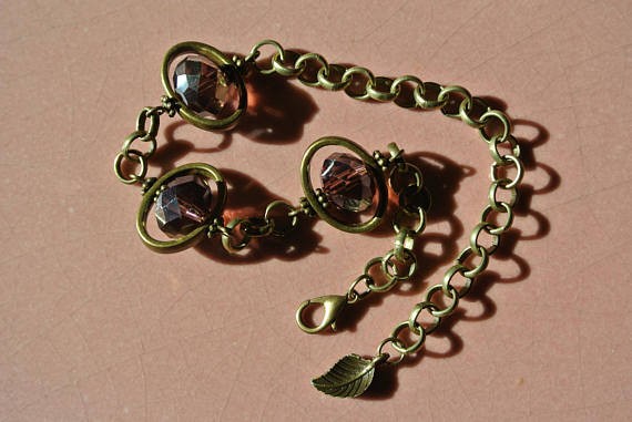 Bracelet maille ronde couleur bronze dans lequel sont insérées des perles à facettes 12 mm en verre de couleur mauve aux reflets dorés encadrées dune perle métal ovale, longueur réglable de 17 à 22 cm, le mousqueton saccroche directement sur le maillon à votre taille Chaîne et mousqueton sans nickel