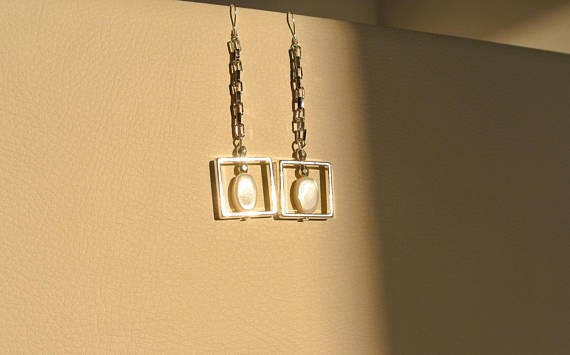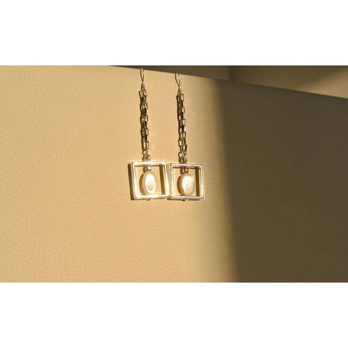 Boucles d'oreilles style contemporain : perle de nacre ovale dans perle métal argenté carrée au bout d'une chaîne