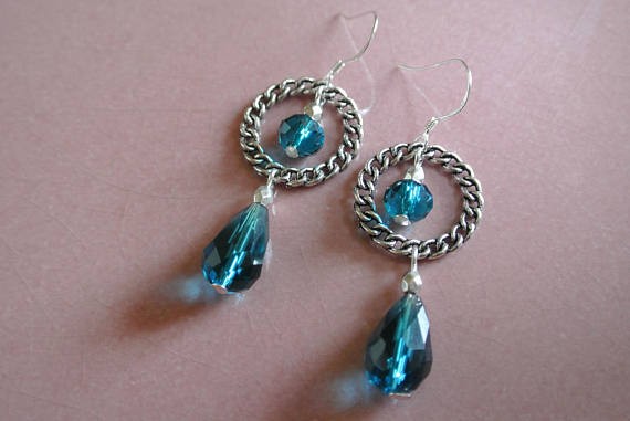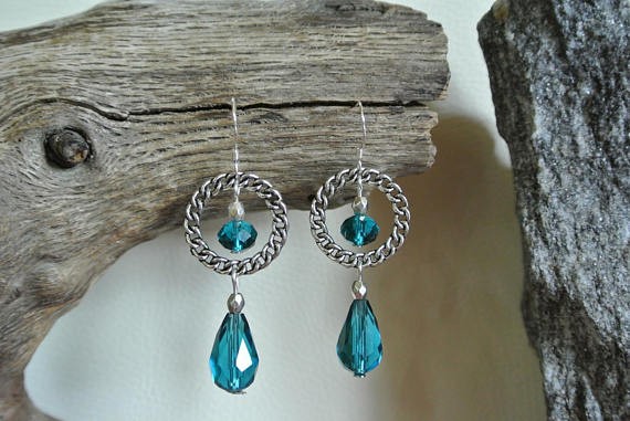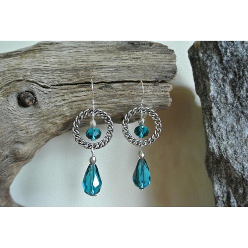 Boucles doreilles perles de verre à facettes turquoise forme goutte et rondelle sur connecteur anneau motif chaîne tressée couleur argent vieilli, crochet argent 925, longueur : 4,5 cm Crochet très fin en argent 925 Livrées avec stoppeurs anti-perte en caoutchouc Prenez soin de ne faire tomber les boucles doreilles, le verre pourrait se casser Vous recevrez les boucles doreilles prises en photo