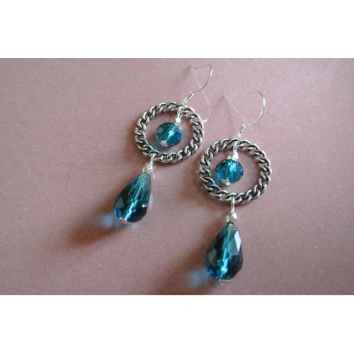 Boucles d'oreilles perles de verre à facettes turquoise forme goutte et rondelle sur connecteur anneau motif chaîne tressée