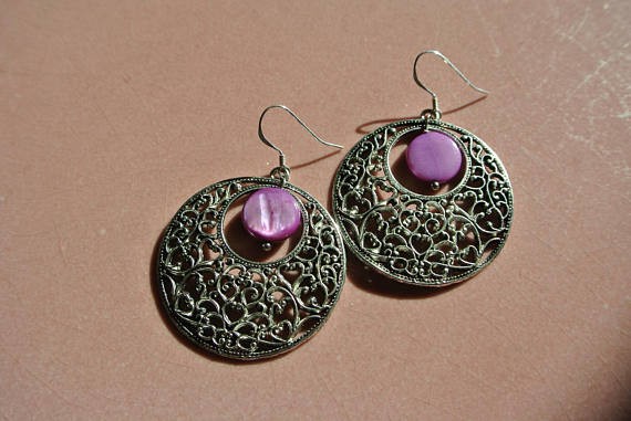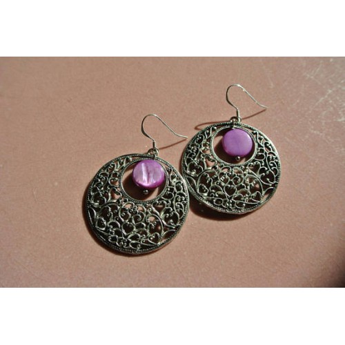 Boucles doreilles connecteurs en métal argent vieilli, type créoles arabesques et perle en nacre violette en forme de palet, crochet en argent 925, longueur : 4 cm Crochet sans nickel et sans plomb